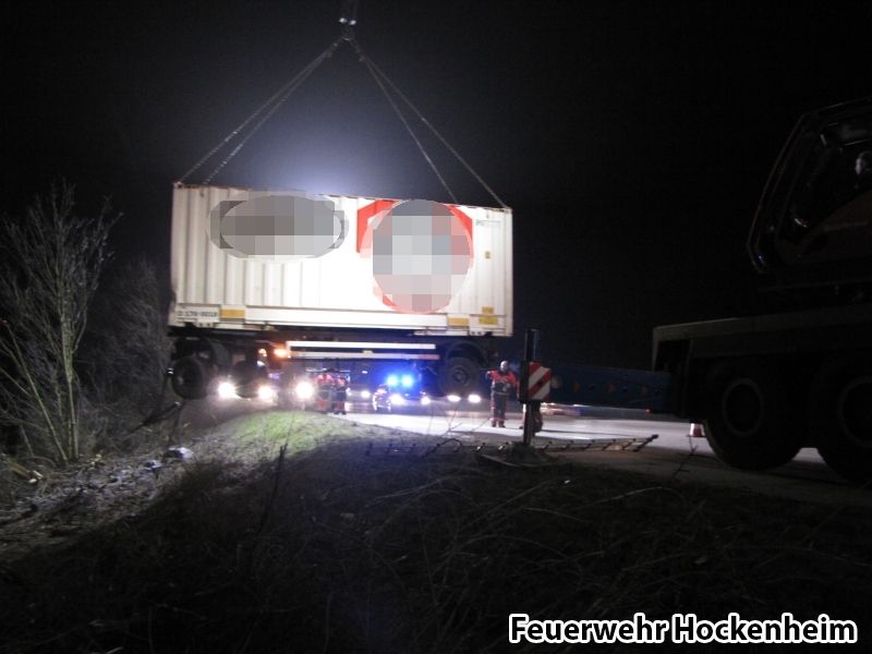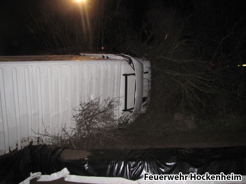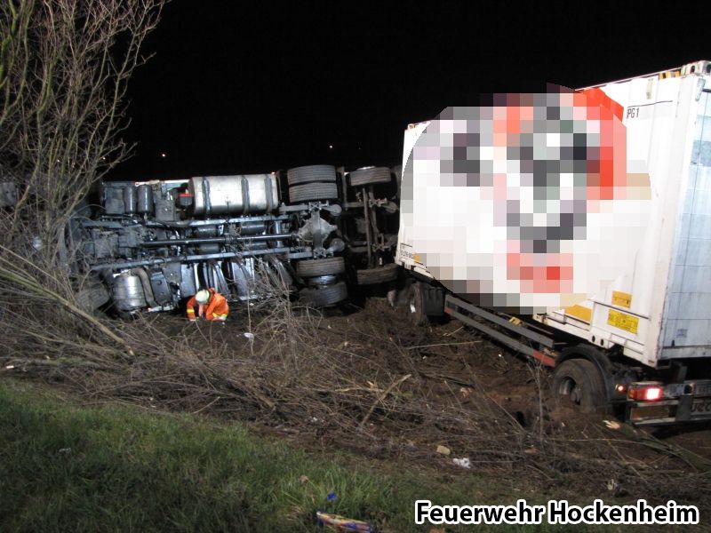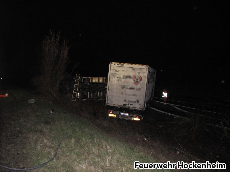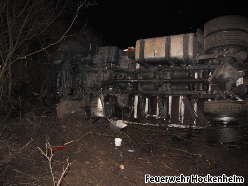 Ein in Richtung Heilbronn fahrender LKW kam kurz vor dem Walldorferkreuz nach rechts von der Fahrbahn ab und stürzte die Böschung hinunter. Sofort nach der Alarmierung machte sich der Rüstzug der Feuerwehr Hockenheim auf den Weg zur Einsatzstelle.