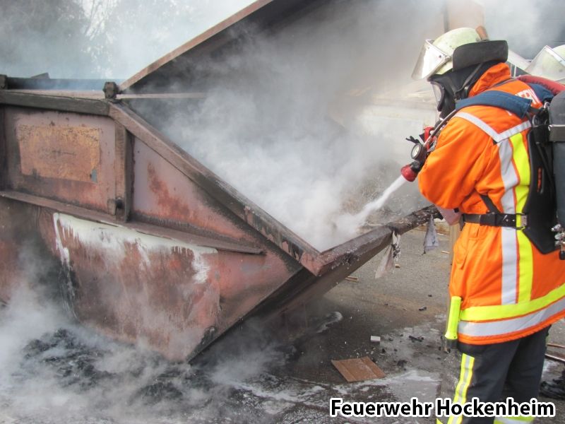 Mit dem Stichwort „Containerbrand“ wurde die Feuerwehr Hockenheim von der Leitstelle Rhein-Neckar ins Industriegebiet Talhaus alarmiert. Dort brannte ein mit Sägespänen gefüllter Container. Der Angriffstrupp ging unter Atemschutz und mit einem C-Rohr zur Brandbekämpfung vor. Nach ein paar Minuten konnte bereits „Feuer schwarz“ gemeldet werden.