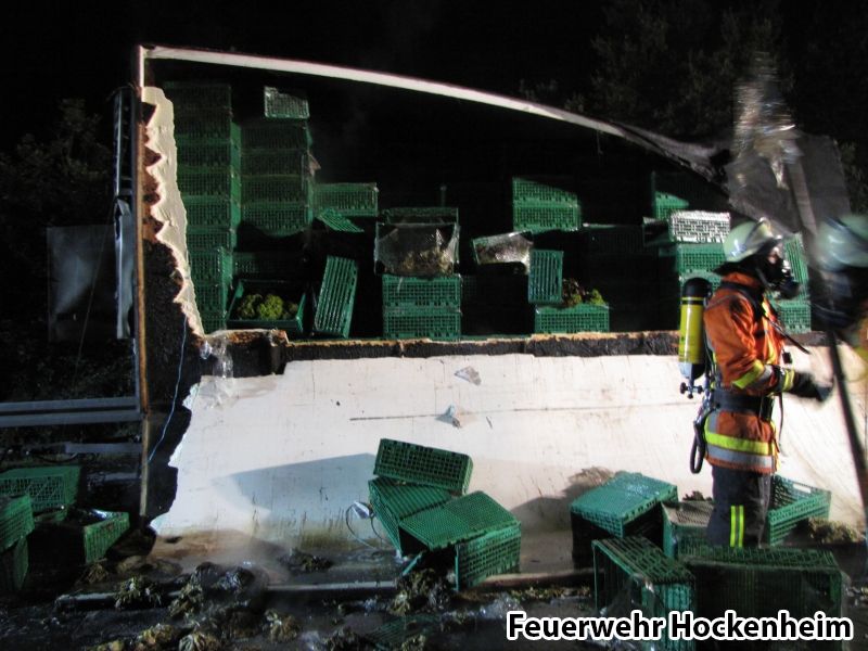Beim Eintreffen der Feuerwehr brannte ein mit Salatköpfen beladener LKW-Anhänger im Bereich der Reifen und Ladebordwand.