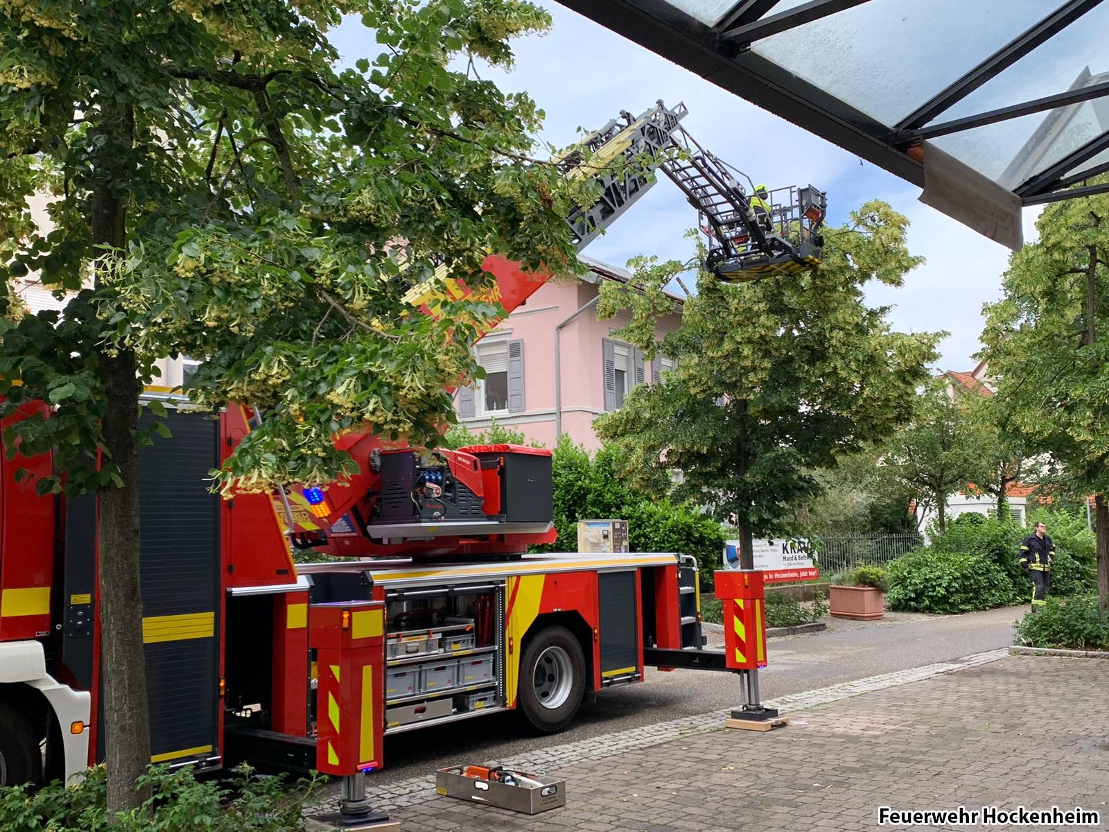 In der Karlsruherstraße ist von einem Baum die Baumkrone gebrochen und könnte herunterfallen. Da die Hockenheimer Drehleiter nicht zur Verfügung stande wurde die Feuerwehr Schwetzingen mit ihrer Drehleiter alarmiert. Mittels Drehleiter wurden die Äste aus dem Baum geholt.