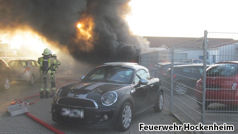Die Feuerwehr Hockenheim wurde mit dem Stichwort "Lagerhallenbrand" in die Neustadterstraße alarmiert. Während der Anfahrt konnte bereits aus der Innenstadt eine große schwarze Rauchwolke wahrgenommen werden. Aus diesem Grund wurde zusätzlich zur Feuerwehr Reilingen noch die Feuerwehren Schwetzingen, Altlußheim und Neulußheim alarmiert. Beim Eintreffen stellte sich allerdings heraus, dass es um mehrere brennende PKW handelte. Das Feuer drohte auf das Gebäude überzugreifen.