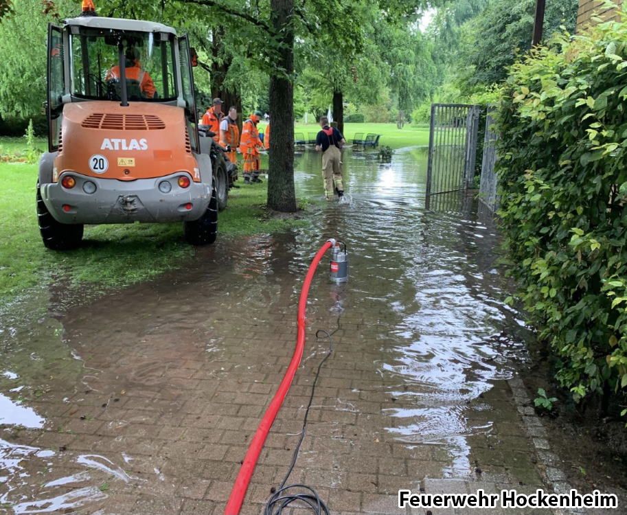 Die Feuerwehr wurde mit dem Stichwort "Überschwemmung, Wasser droht in Trafostation zu laufen" alarmiert. Aufgrund des Starkregens drohte das Wasser der Kraichbach in eine Trafostation der Stadtwerke zu laufen. Zur Unterstützung des Bauhofs wurden zwei Paletten leere Sandsäcke zur Befüllung zum Bauhof transportiert. Außerdem wurde eine Tauchpumpe im Bereich vor und in der Trafostation eingesetzt, sowie Wassersauger zur Beseitigung des Wassers.