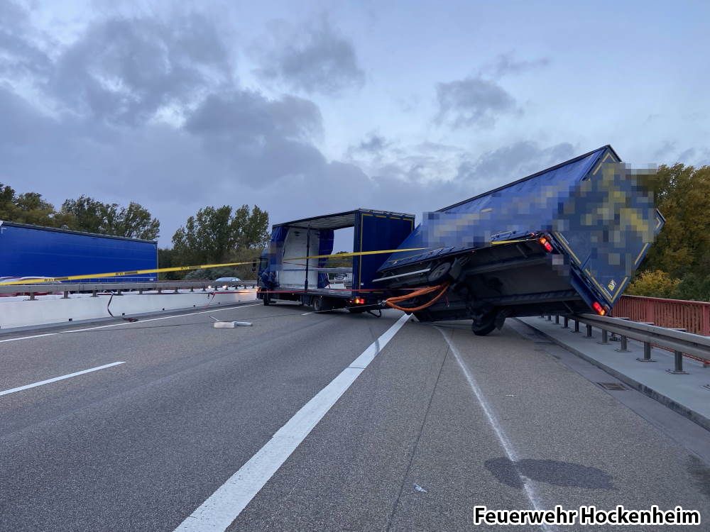 Die Feuerwehr Hockenheim wurde mit dem Stichwort "Verkehrsunfall / mehrere LKW" auf die Rheinbrücke auf der BAB61 alarmiert. Vor Ort war durch den starken Wind der Anhänger von einem LKW auf dem Brückengeländer gelegen. Die Feuerwehr Speyer war bereits vor Ort. Da es sich um Speyerer Gemarkung handelte übernahm diese auch die Einsatzleitung. Der Anhänger wurde mit Spanngurten gegen wegrutschen gesichert. Es wurde eine Fachfirma zur Bergung des Anhängers angefordert. Mit einer Seilwinde und einem Kran wurde der Anhänger wieder aufgestellt.