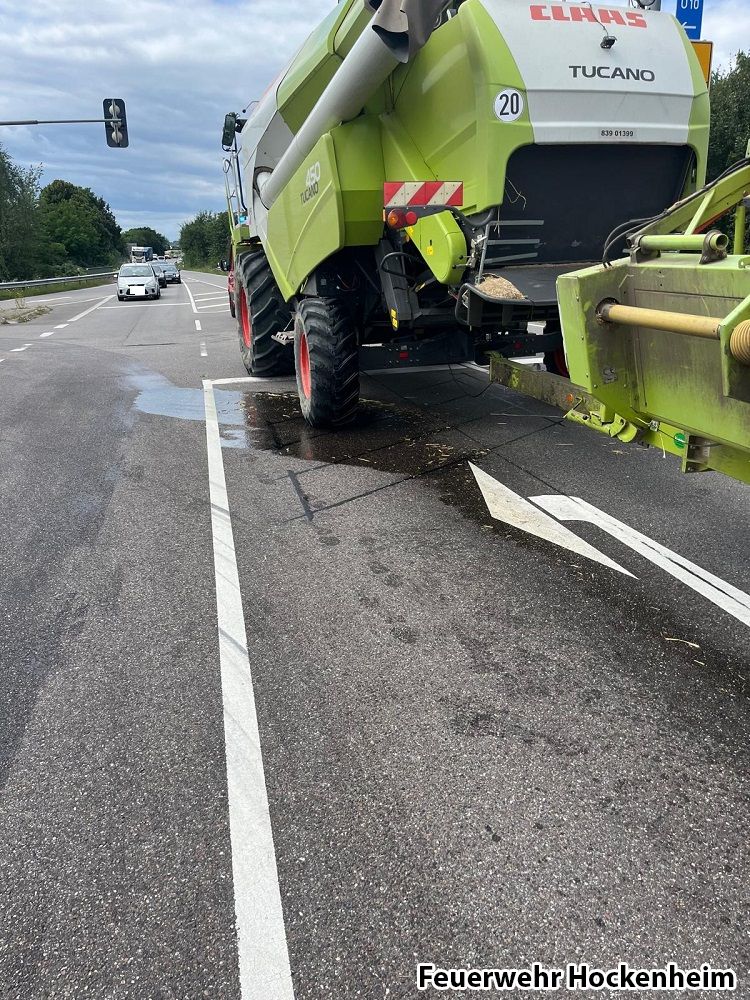 Die Feuerwehr Hockenheim wurde auf die B39 wegen auslaufender Betriebsstoffe bei einem Mähdrescher alarmiert.