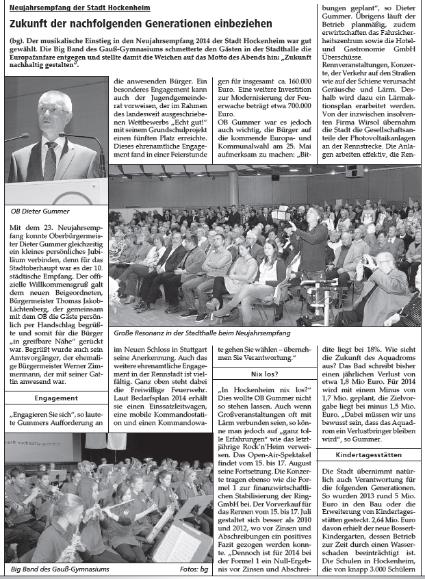 Der musikalische Einstieg in den Neujahrsempfang 2014 der Stadt Hockenheim war gut gewählt. Die Big Band des Gauß-Gymnasiums schmetterte den Gästen in der Stadthalle die Europafanfare....