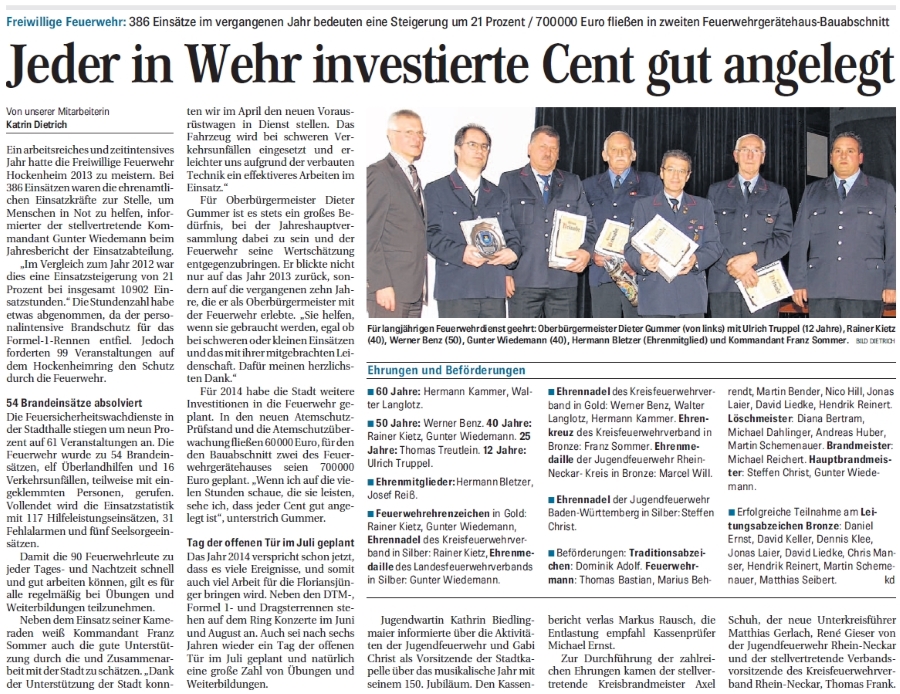 Ein arbeitsreiches und zeitintensives Jahr hatte die Freiwillige Feuerwehr Hockenheim 2013 zu meistern. Bei 386 Einsätzen waren die ehrenamtlichen Einsatzkräfte zur Stelle, um Menschen in Not zu helfen...