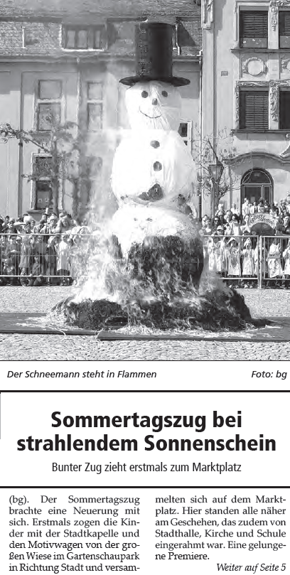 Der Sommertagszug brachte eine Neuerung mit sich. Erstmals zogen die Kinder mit der Stadtkapelle und den Motivwagen von der großen Wiese im Gartenschaupark in Richtung Stadt und versammelten ....