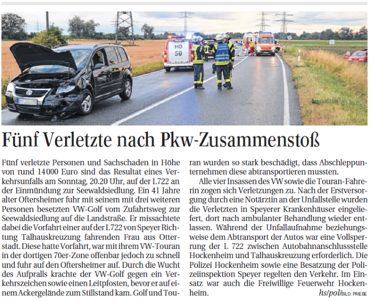 Fünf Verletzte nach Pkw-Zusammenstoß Fünf verletzte Personen und Sachschaden in Höhe von rund 14000 Euro sind das Resultat eines Verkehrsunfalls am Sonntag, 20.20 Uhr, auf der L722 an der Einmündung zur Seewaldsiedlung. Ein 41 Jahre alter...