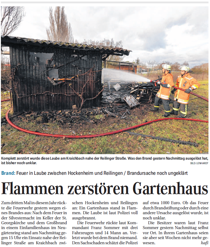 Brand: Feuer in Laube zwischen Hockenheim und Reilingen / Brandursache noch ungeklärt