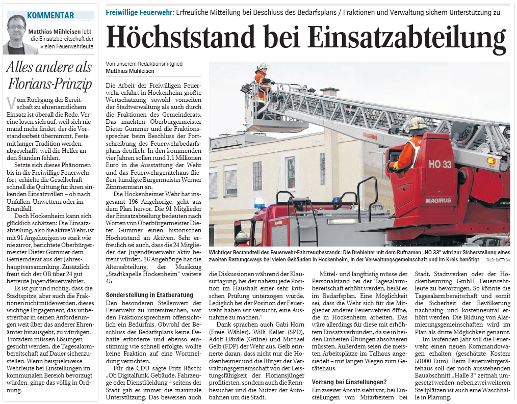 Die Arbeit der Freiwilligen Feuerwehr erfährt in Hockenheim größte Wertschätzung sowohl von seiten der Stadtverwaltung als auch durch die Fraktion des Gemeinderats.