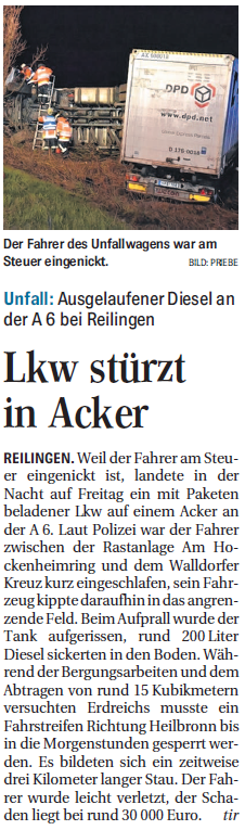 Weil der Fahrer am Steuer eingenickt ist, landete in der Nacht auf Freitag ein mit Paketen beladener LKW auf einem Acker an der A6.