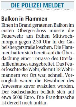 Balkon in Flammen Einen in Brand geratenen Balkon im ersten Obergeschoss musste die Feuerwehr am frühen Mittwochmorgen gegen 2.30 Uhr in der Gabelsbergerstraße löschen. Die Flammen....