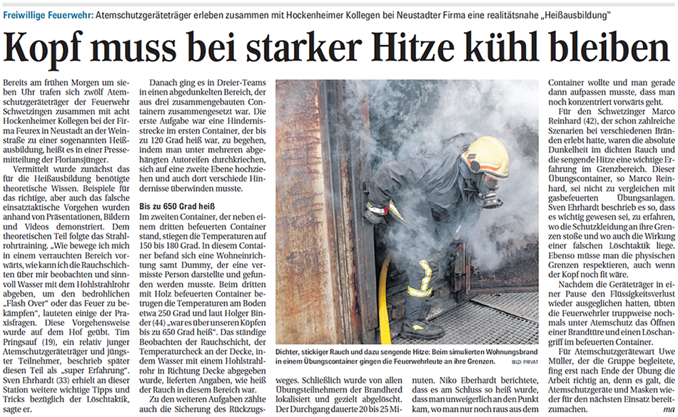 Kopf muss bei starker Hitze kühl bleiben Bereits am frühen morgen um sieben Uhr trafen sich zwölf Atemschutzgeräteträger der Feuerwehr Schwetzingen zusammen mit acht Hockenheimer Kollegen bei der Firma Feurex in Neustadt....