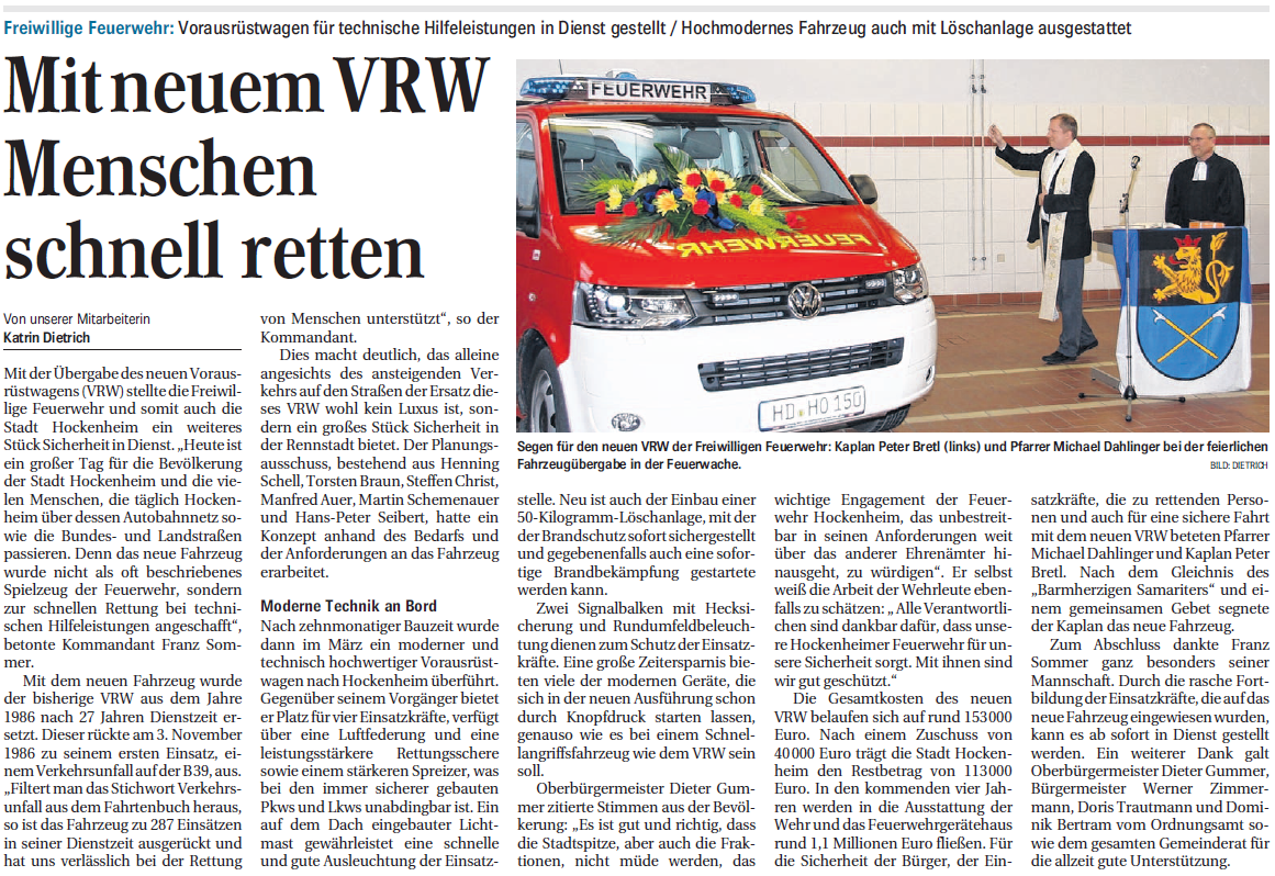 Mit der Übergabe des neuen Vorausrüstwagen (VRW) stellte die Freiwillige Feuerwehr und somit auch die Stadt Hockenheim ein weiteres Stück Sicherheit in Dienst. "Heute ist ein großer Tag.....