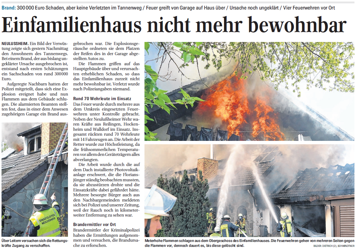 Einfamilienhaus nicht mehr bewohnbar Ein Bild der Verwüstung zeigte sich gestern den Anwohnern des Tannenwegs. Bei einem Brand, der aus ungeklärter Ursache ausgebrochen ist, entstand nach ersten Schätzungen ein Sachschaden von rund 300 000 Euro.....