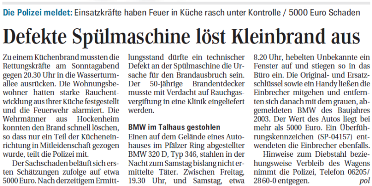 Defekte Spülmaschine löst Kleinbrand aus Zu einem Küchenbrand mussten die Rettungskräfte am Sonntagabend gegen 20.30 Uhr in die Wasserturmallee ausrücken. Der Wohnungsbewohner hatte starke Rauchentwicklung aus ihrer Küche.....