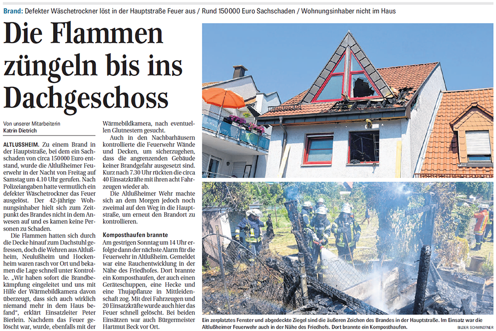 Die Flammen züngeln bis ins Dachgeschoss Zu einem Brand in der Hauptstraße (Altlußheim), bei dem ein Sachschaden von circa 150.000 € entstand, wurde die Altlußheimer Feuerwehr in der Nacht von Freitag auf Samstag um 04.10 Uhr gerufen...