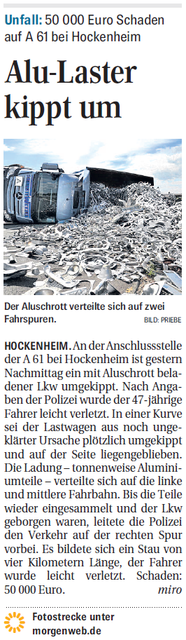 Alu-Laster kippt um An der Anschlussstelle der A 61 bei Hockenheim ist gestern Nachmittag ein mit Aluschrott beladener LKW umgekippt. Nach Angaben der Polizei wurde der 47-jährige Fahrer leicht verletzt....