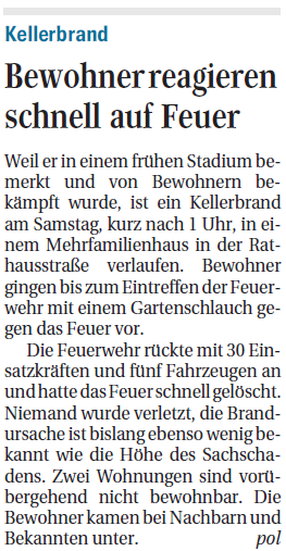 Bewohner reagieren schnell auf Feuer Weil er in einem frühen Stadium bemerkt und von Bewohnern bekämpft wurde, ist ein Kellerbrand am Samstag, kurz nach 1 Uhr, in einem Mehrfamilienhaus in der Rathausstraße.....