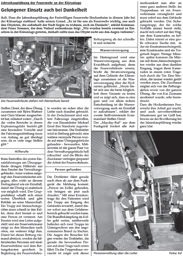 Gelungener Einsatz auch bei Dunkelheit Dass die Jahreshauptübung der Freiwilligen Feuerwehr Hockenheim in diesem Jahr bei der Kläranlage stattfand hat seinen Grund. "Es ist für uns als Feuerwehr wichtig, uns auch den Objekten, die außerhalb der ....