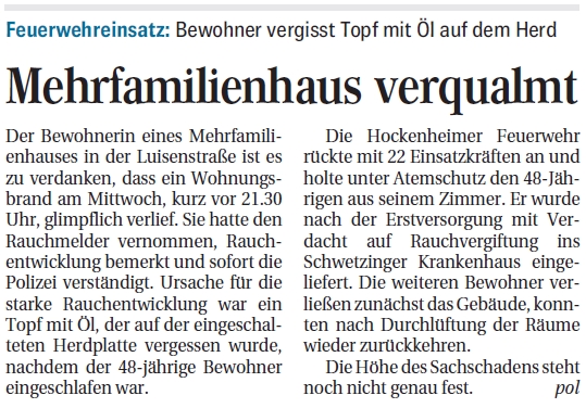 Mehrfamilienhaus verqualmt Der Bewohnerin eines Mehrfamilienhauses in der Luisenstraße ist es zu verdanken, dass ein Wohnungsbrand am Mittwoch, kurz vor 21.30 Uhr, glimpflich verlief. Sie hatte den Rauchmelder vernommen......