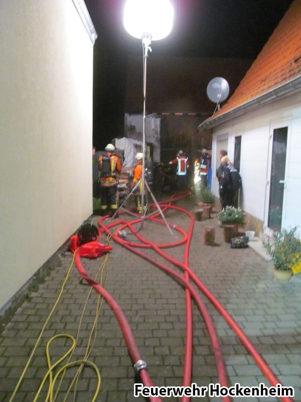 Die Feuerwehr wurde zu einem Holzlagerbrand in die Heidelbergerstraße alarmiert. Das Feuer drohte auf eine Scheune überzugreifen. Die Dachbalken waren bereits angegriffen.