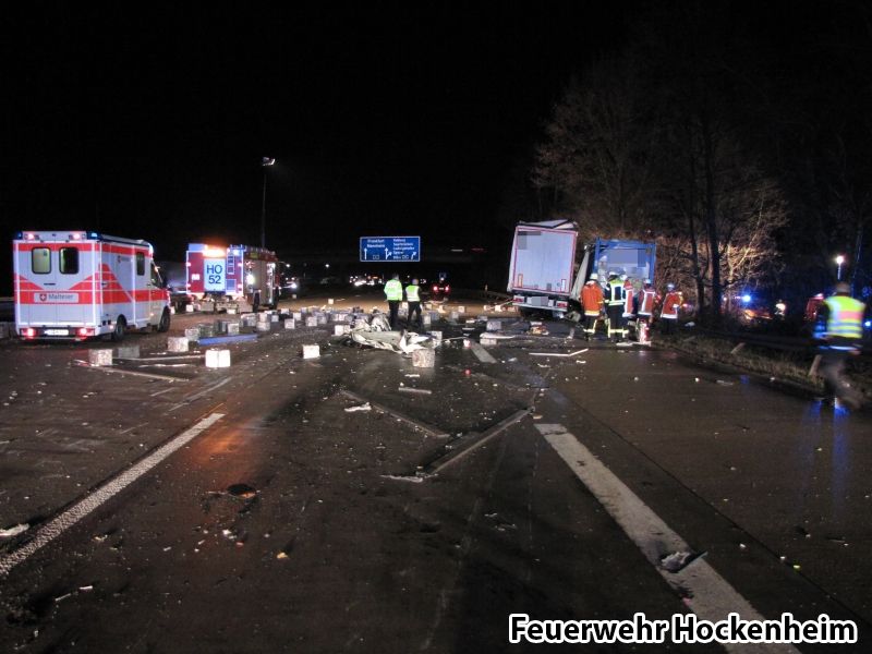Auf der BAB 6 in Fahrtrichtung Mannheim kam es an der Raststätte Hockenheimring-Ost zu einem schweren Verkehrsunfall zwischen zwei Lastwagen. Ein Fahrer war in seinem Führerhaus eingesperrt. Die Beifahrertür wurde mit hydraulischem Rettungsgerät entfernt, um eine schonende Rettung zu ermöglichen. Beide Fahrer kamen zur Untersuchung in umliegende Krankenhäuser. Ein LKW hatten einen noch nicht gereinigten aber leeren Gefahrgut-Tankcontainer geladen, welcher jedoch nicht beschädigt wurde. Der zweite LKW hatte einige hundert Metallwürfel geladen, wovon sich viele auf der gesamten Fahrbahn verteilten. Die Einsatzstelle wurde abgesichert, großflächig ausgeleuchtet und der Brandschutz sichergestellt. Im weiteren Verlauf des Einsatzes wurden noch sukzessive zwei Fahrspuren geräumt, damit diese wieder für den Verkehr freigegeben werden konnten. Abschließend wurde die Einsatzstelle an die Autobahnpolizei übergeben.