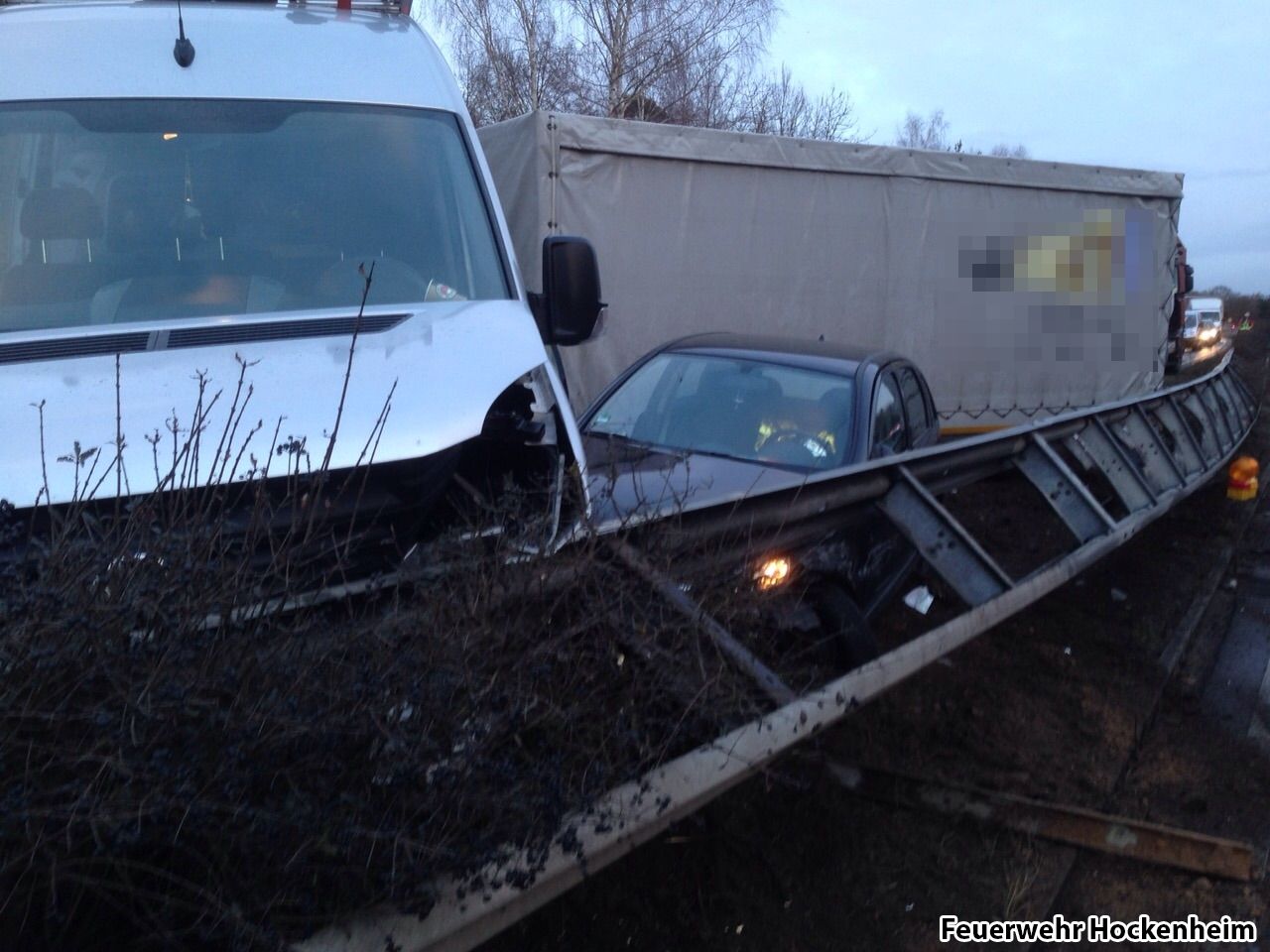 Die Feuerwehr Hockenheim wurde zu einem Verkehrsunfall auf die B36 (Fahrtrichtung Karlsruhe) alarmiert. Aufgrund der ungenauen Ortsangabe mussten große Bereiche der B36, L723 (ehem. B39) und L722 abgefahren werden. Im Laufe unseres Einsatzes machte sich auch die Feuerwehr Schwetzingen mit dem VRW auf die Suche nach der Einsatzstelle. Nach dem Eintreffen der Kräfte an der Unfallstelle war die Fahrerin bereits vom Rettungsdienst versorgt. Ihr Auto war zwischen der Mittelleitplanke und einem Montagefahrzeug mit Anhänger eingeklemmt, jedoch konnte die Beifahrertür geöffnet werden. Die Bundesstrasse wurde in Abstimmung mit der Polizei komplett gesperrt und die Gegenfahrbahn von Trümmerteilen und Erde befreit.