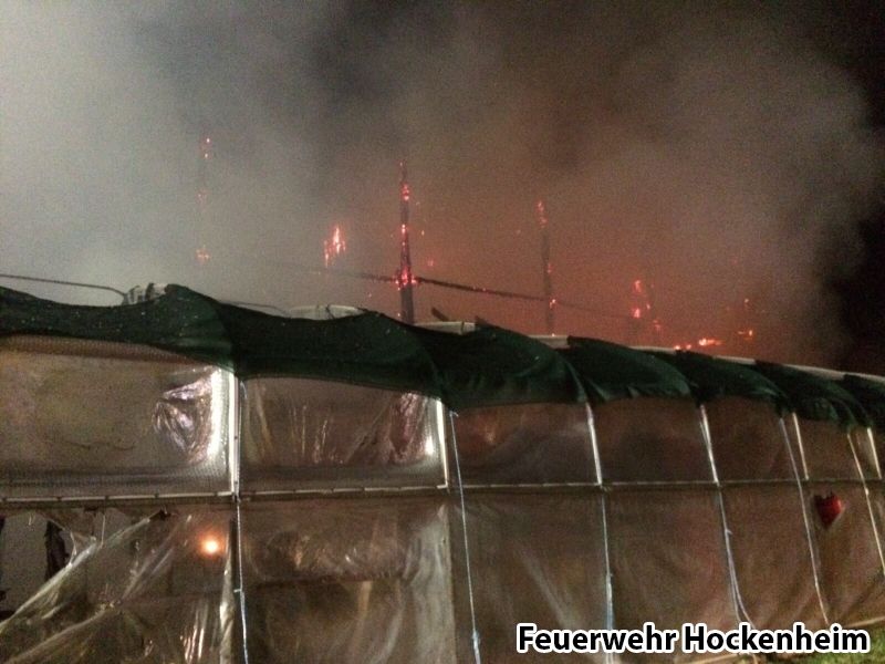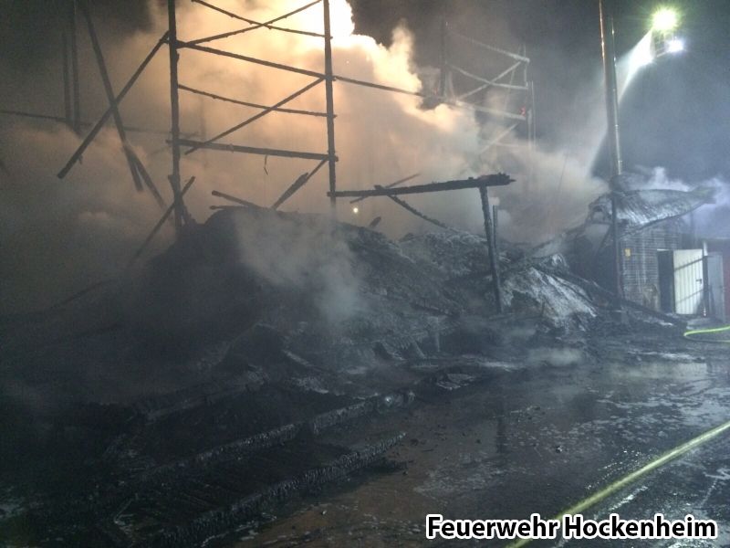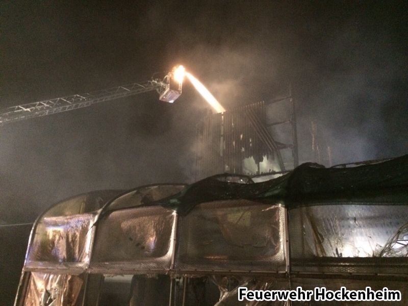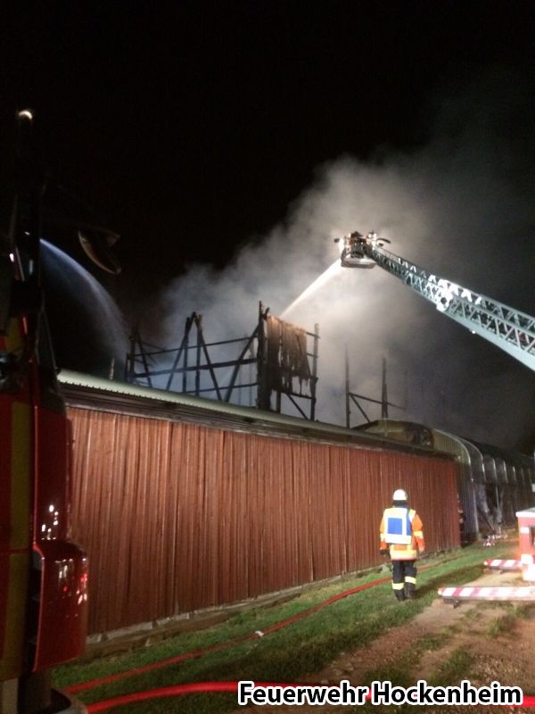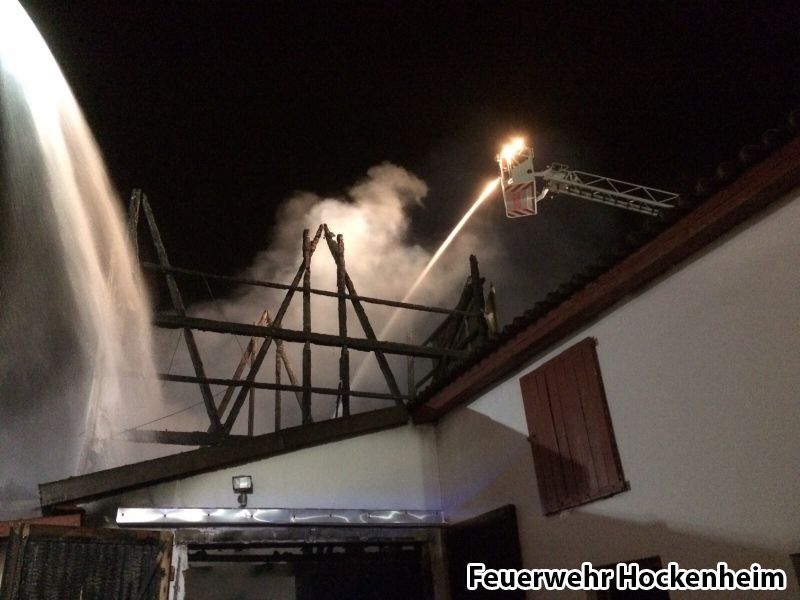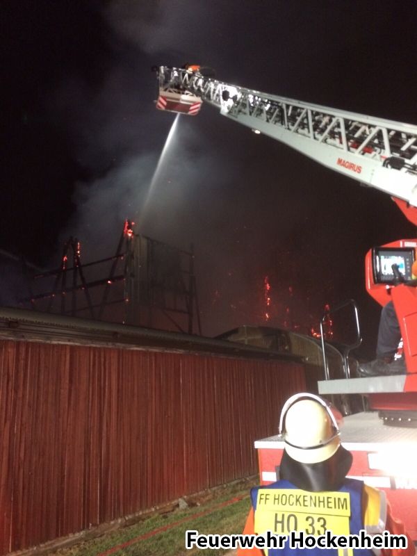 Die Feuerwehr Hockenheim wurde zur Unterstützung der Feuerwehr Schwetzingen bei einem ausgedehnten Scheunenbrand angefordert. Der Hockenheimer Löschzug übernahm die Brandbekämpfung auf der Gebäuderückseite mittels Wenderohr aus der Drehleiter und zwei C-Rohren unter Atemschutz. Ein weiteres Löschgruppenfahrzeug verblieb auf der Hockenheimer Feuerwache, um den Gebietsschutz für Schwetzingen und Hockenheim sicherzustellen.