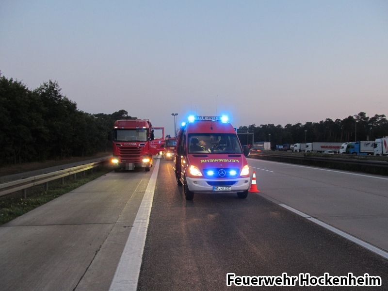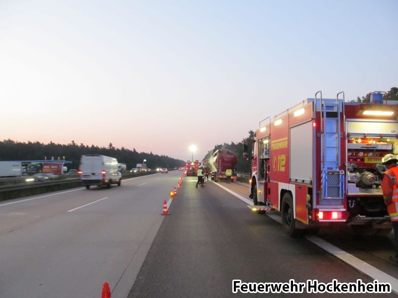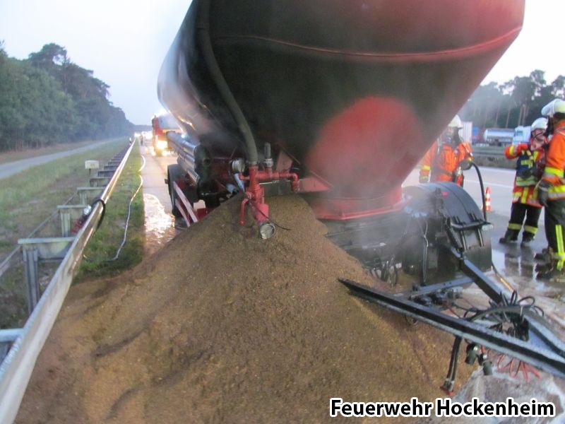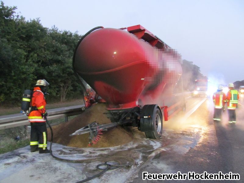 Wir wurden auf die BAB 6 zum Brand eines LKW-Anhängers alarmiert. Der Fahrer hatte bereits nach einem ersten Löschversuch seine Zugmaschine abgekoppelt und auf dem Standstreifen in Sicherheit gebracht. Mittels den beiden Schnellangriffsleitungen vom Löschgruppenfahrzeug und Tanklöschfahrzeug wurde unter Atemschutz das Feuer am Anhänger gelöscht. Da das Silo durch die Hitzeeinwirkung einen Riss hatte, trat ein Teil des geladenen Rapsschrots auf die Fahrbahn aus. Während der Löschmaßnahmen war die rechte Fahrbahn in Richtung Heilbronn gesperrt. Anschließend wurde die Einsatzstelle an die Autobahnpolizei übergeben.