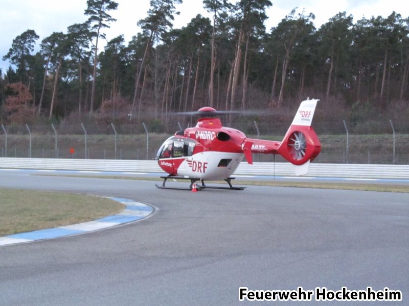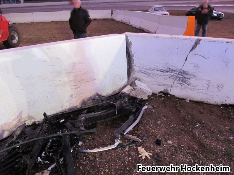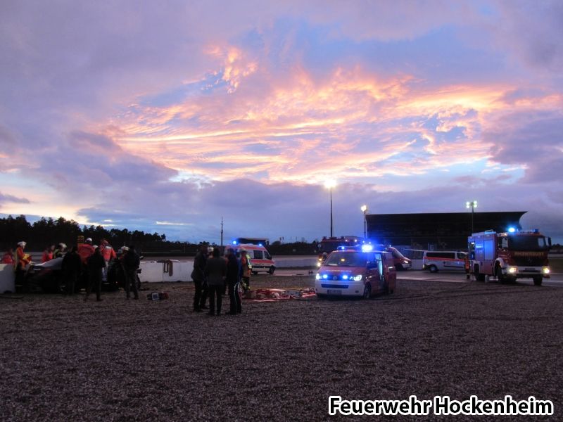 Auf dem Hockenheimring kam es bei einer Veranstaltung zu einem schweren Verkehrunsfall. Dort ist ein PKW von der Strecke abgekommen und frontal gegen eine Betonmauer gekracht. Der Fahrer des PKW war in dem Fahrzeug eingeklemmt. Nach Rücksprache mit dem Notarzt wurde eine schonende Rettung eingeleitet. Bei dieser wurde das Dach mittels hydraulischem Rettungsgerät entfernt.