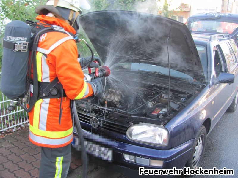 Beim Eintreffen brannte ein PKW im Motorraum. Die Haube wurde geöffnet und der Brand mit dem Schnellangriff von einem Trupp unter Atemschutz abgelöscht. Der Motorraum wurde mit der Wärmebildkamera kontrolliert. Danach wurde die Einsatzstelle an die Polizei übergeben.