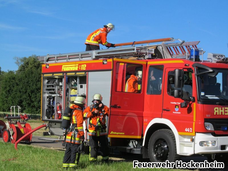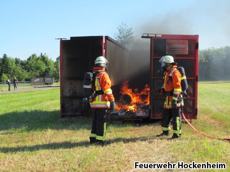 Auf einem Feld gegenüber eines Bauernhofes brannte Müll in einem Abrollcontainer. Der Brand wurde mit einem C-Rohr unter Atemschutz abgelöscht. Der Bereich um den Container wurde ebenfalls bewässert.
