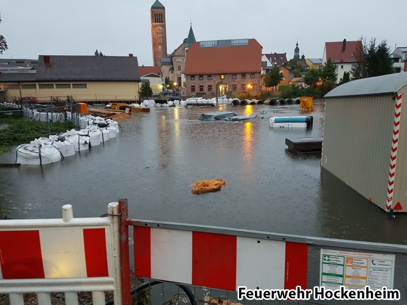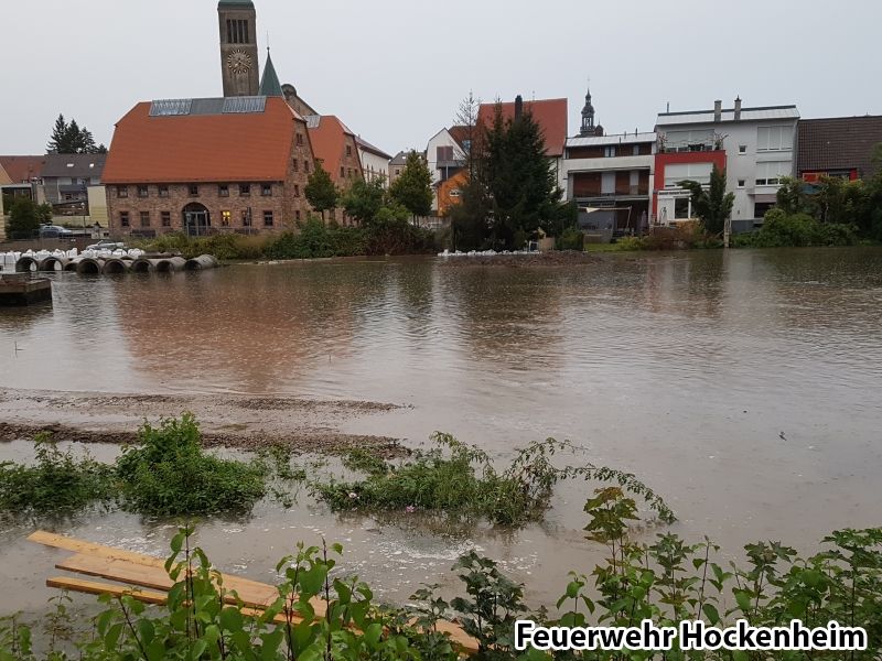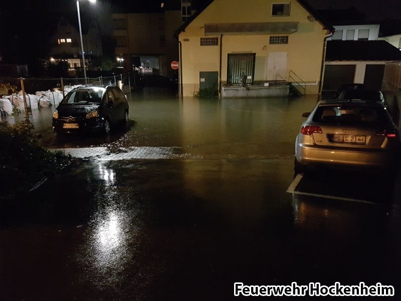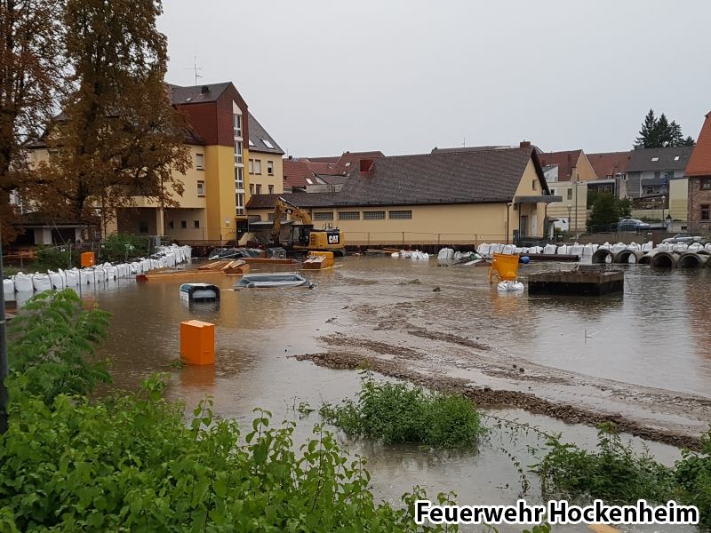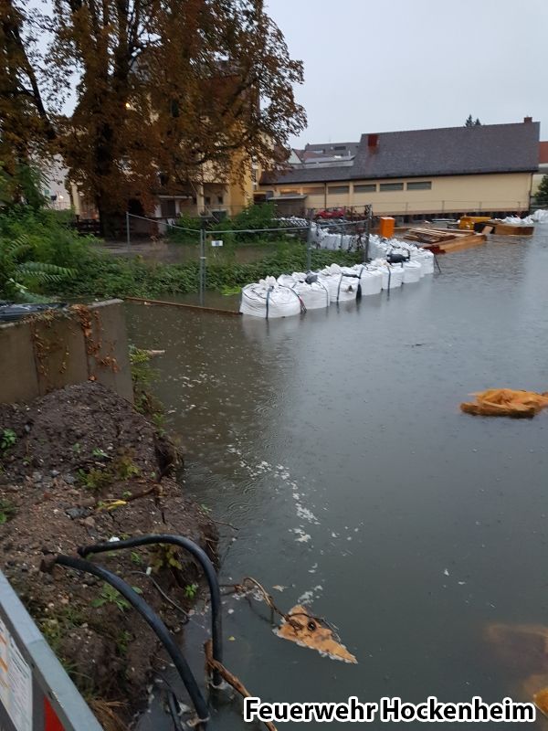 Aufgrund der Baumaßnahme "HÖP" ist der Überflutungsbereich an der Kraichbach mit Wasser vollgelaufen. Insgesamt war eine Fläche von ca. 4000 m² überflutet. Ebenso wurde der Mühlkanal wieder komplett geflutet. Dadurch war eine Tiefgarage ca. 15 cm unter Wasser gesetzt und auch in die Shisha Bar ist Wasser eingedrungen. Daraufhin wurde der Bauleiter telefonisch alarmiert und die Bewohner aufgefordert, ihre Fahrzeuge aus der Tiefgarage zu bringen. Aufgrund der Überflutung war auch der Weg zwischen NKD und Zehntscheune/Untere Mühlstr. nicht mehr zu passieren und wurde mit Flatterband abgesperrt. Nach Eintreffen des Bauleiters wurde das weitere Vorgehen besprochen. Die Firma stellte der Shisha Bar Sandsäcke zur Verfügung und setzte Bigpacks in den Mühlkanal. Als erstes jedoch wurden die verbauten Rohre mit dem Bagger von Unrat befreit. Daraufhin konnte ein deutliches Absinken des Wassers festgestellt werden.