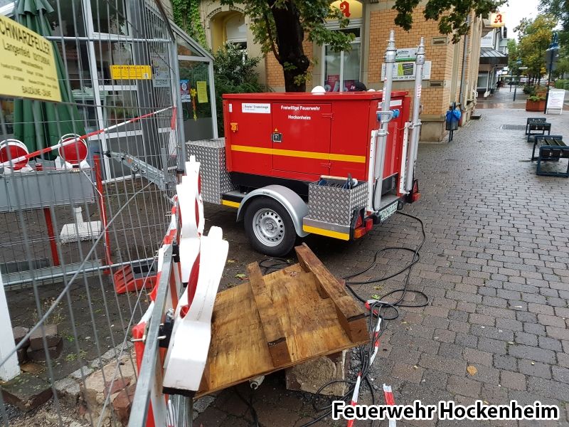 Aufgrund der Überflutung ist die Baustromversorgung ausgefallen. Daraufhin wurde der FwA-Strom zur Einsatzstelle gebracht. Somit konnte die Baufirma 2 Tauchpumpen in Betrieb nehmen, um das Wasser aus dem Mühlkanal wieder in die Kraichbach zu pumpen.