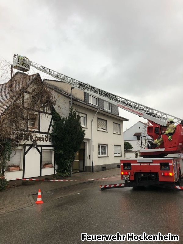 Wir wurden von der Feuerwehr Altlußheim in die dortige Hauptstraße angefordert. Mittels Drehleiter mussten ein paar Dachziegel entfernt werden.