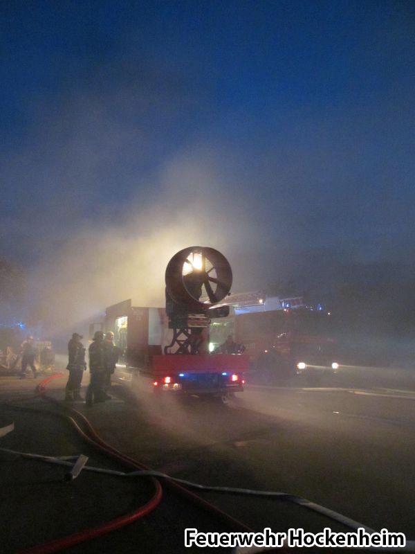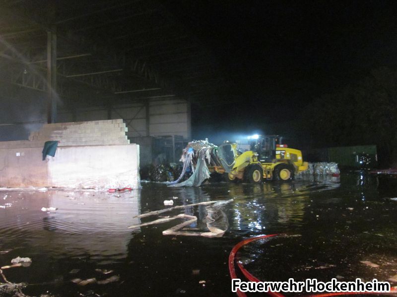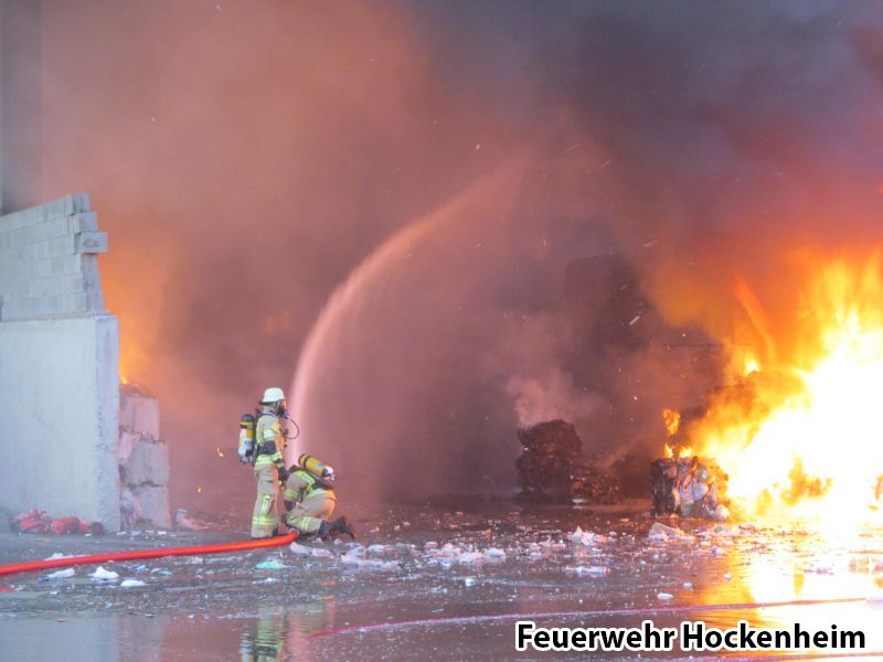 Beim Eintreffen brannte die Halle in voller Ausdehnung. Die Feuerwehr Reilingen wurde bei der Einsatzleitung sowie bei der Brandbekämpfung unterstützt.