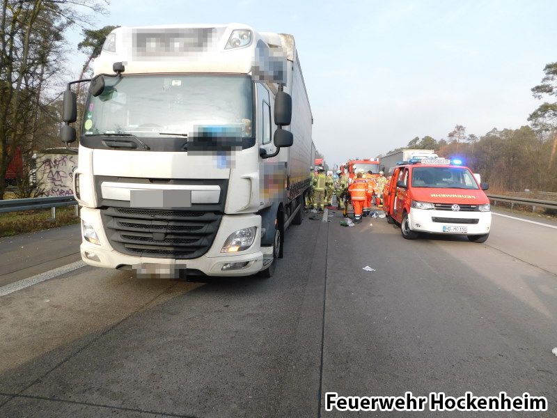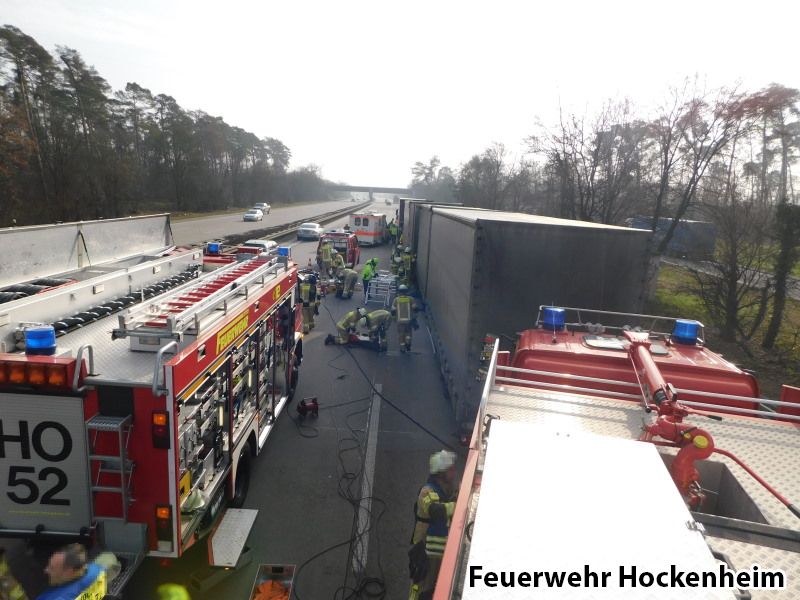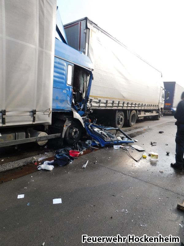 Die Feuerwehr Hockenheim wurde zu einem Verkehrsunfall zwischen zwei LKW auf die Autobahn 6 in Richtung Heilbronn alarmiert. Vor Ort ist ein LKW auf den anderen aufgefahren. Beim Eintreffen war in dem hinteren LKW eine Person eingeklemmt. Diese wurde mittels hydraulischem Rettungsgerät befreit und dem Rettungsdienst übergeben. Während der Maßnahme waren zwei Spuren der Autobahn gesperrt. Die Einsatzstelle wurde ebenfalls abgesichert und ein Sichtschutz aufgebaut.
