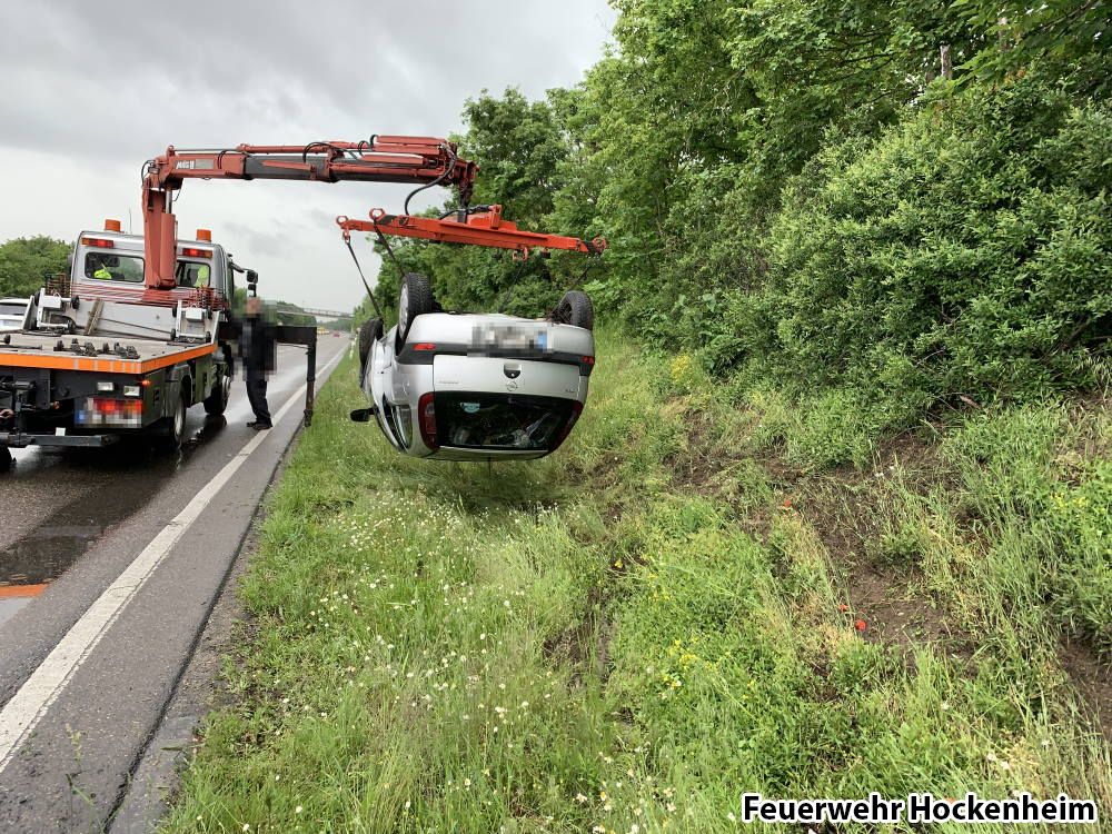 Die Feuerwehr Hockenheim wurde zu einem Verkehrsunfall auf die B39 alarmiert. Vor Ort lag ein PKW im Graben auf dem Dach. Die Person wurde noch vor Eintreffen der Feuerwehr befreit und bereits vom Rettungsdienst betreut. Von der Feuerwehr wurde die Einsatzstelle bis zum Abtransport durch ein Abschleppunternehmen abgesichert.