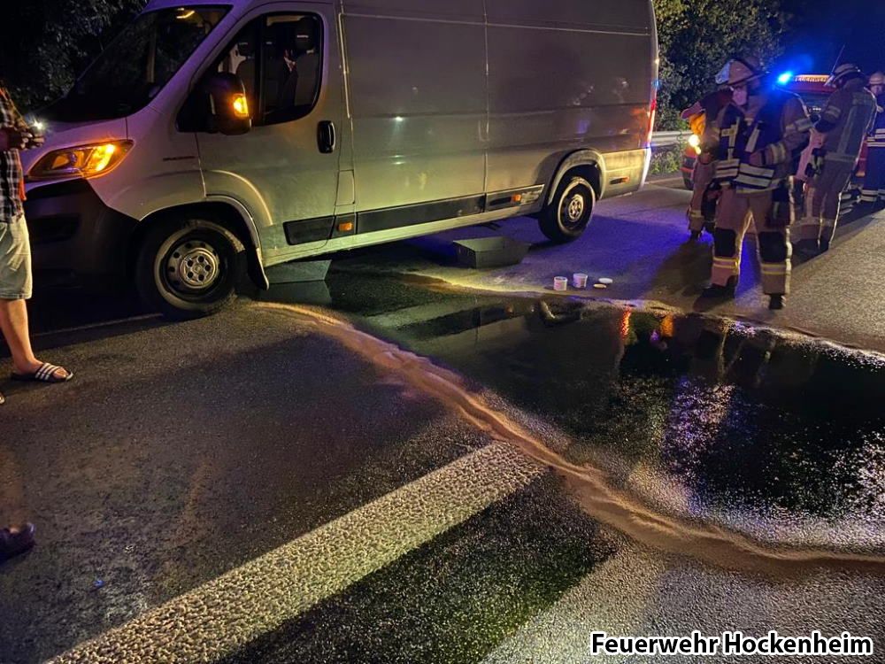 Mit dem Stichwort "Verkehrsunfall, unklare Lage" wurde die Feuerwehr Hockenheim auf die BAB61 alarmiert. Bei Eintreffen konnte kein Verkehrsunfall vorgefunden werden. Ein Transporter war über einen Gegenstand gefahren und hatte sich dabei den Tank beschädigt. Aus diesem ist Kraftstoff ausgetreten. Der austretende Kraftstoff wurde mittels Mulde aufgefangen und das Leck mittels Leckstop abgedichtet.