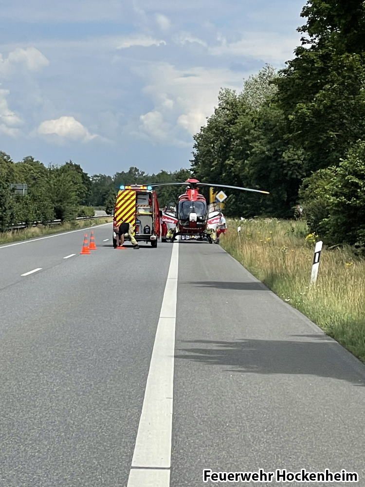 Die Feuerwehr Hockenheim wurde zur Unterstützung des Rettungsdienstes auf die B39 alarmiert. Vor Ort kam es zu einem schweren Motorradunfall. Beim Eintreffen war die Polizei, Rettungsdienst sowie der Notarzt bereits vor Ort. Der Rettungshubschrauber war im Anflug. Die Feuerwehr unterstützte beim Transport der Person zum Rettungshubschrauber. Desweiteren wurde das Motorrad auf auslaufende Betriebsstoffe kontrolliert.