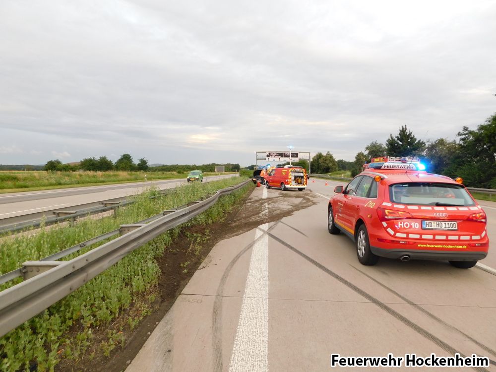 Mit der Meldung "Verkehrsunfall, PKW in Leitplanke" wurde die Feuerwehr Hockenheim auf die BAB6 alarmiert. Bei Eintreffen zwei beteiligte PKW auf linker Fahrspur kollidiert und in Leitplanke gerutscht. Es waren keine Personen eingeklemmt. Eine leicht verletzte Person wurde bis zum Eintreffen des Rettungsdienstes durch die Besatzung vom VRW versorgt. Außerdem wurden die Batterien der Unfallfahrzeuges abgeklemmt, die Einsatzstelle abgesichert und die Fahrbahn grob gereinigt.