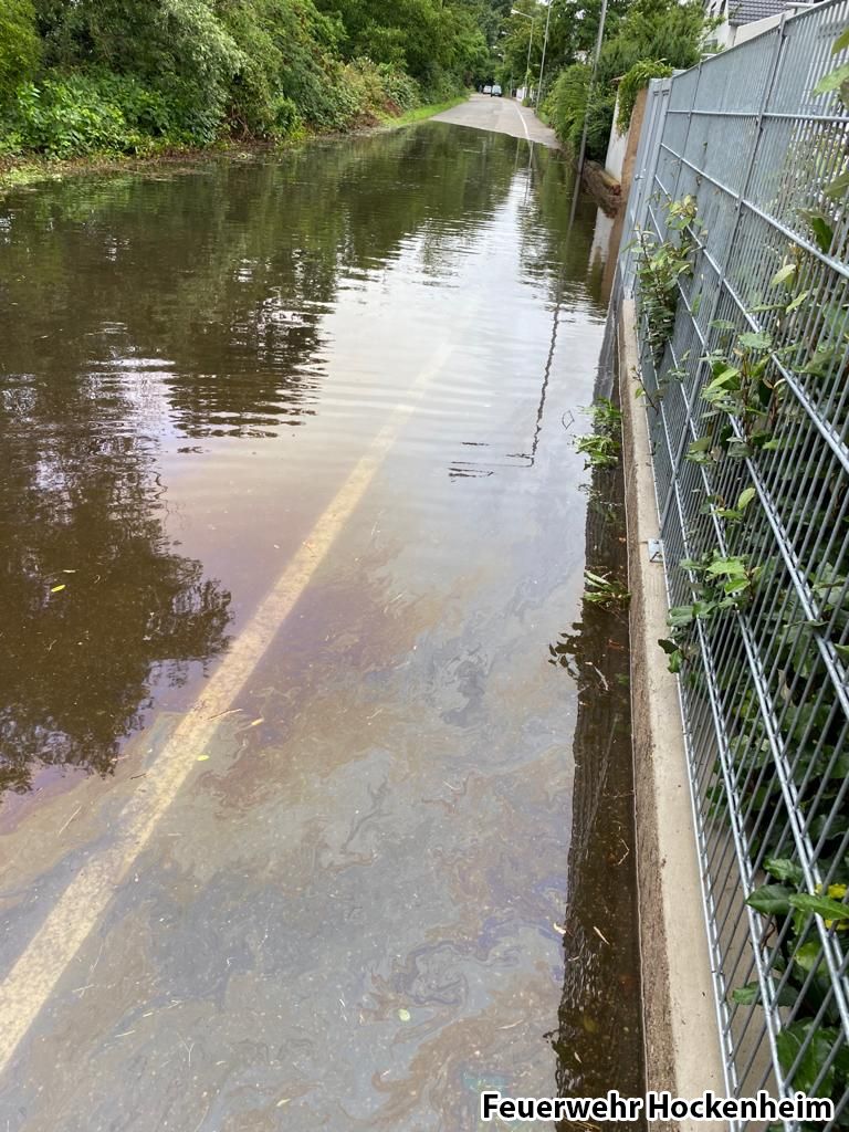 Mit der Meldung "Ölfilm auf überfluteter Straße" wurde die Feuerwehr alarmiert. Mindestens ein PKW war durch die überflutete Straße im Bereich "Hinter den Bergen" gefahren und hatte dabei einen Ölfilm auf dem Wasser hinterlassen. Um weitere Schäden zu vermeiden, wurde die Straße nach Rücksprache mit der Polizei durch den Bauhof gesperrt. Durch die Feuerwehr wurde der Senkkasten eines Gullis im überfluteten Bereich entfernt, anschließend konnte das Wasser abfliessen. Die Kläranlage wurde über den Ölfilm informiert.