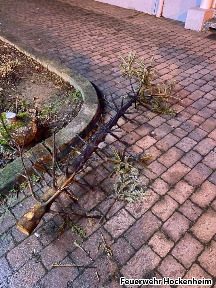 Mit der Meldung "Kleinfeuer, brennt Tannenbaum" wurde die Feuerwehr Hockenheim in die Untere Hauptstraße alarmiert. Ein ausgedienter Tannenbaum glimmte an mehreren Stellen am Straßenrand. Es wurden Nachlöscharbeiten durchgeführt und die Straße grob mittels Besen gereinigt.