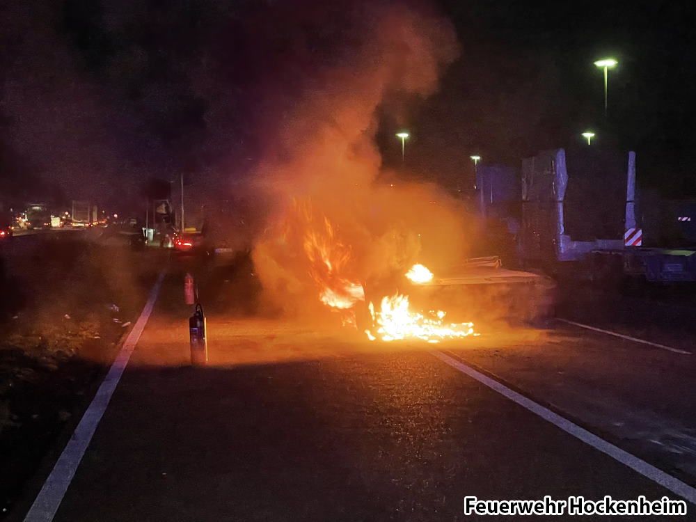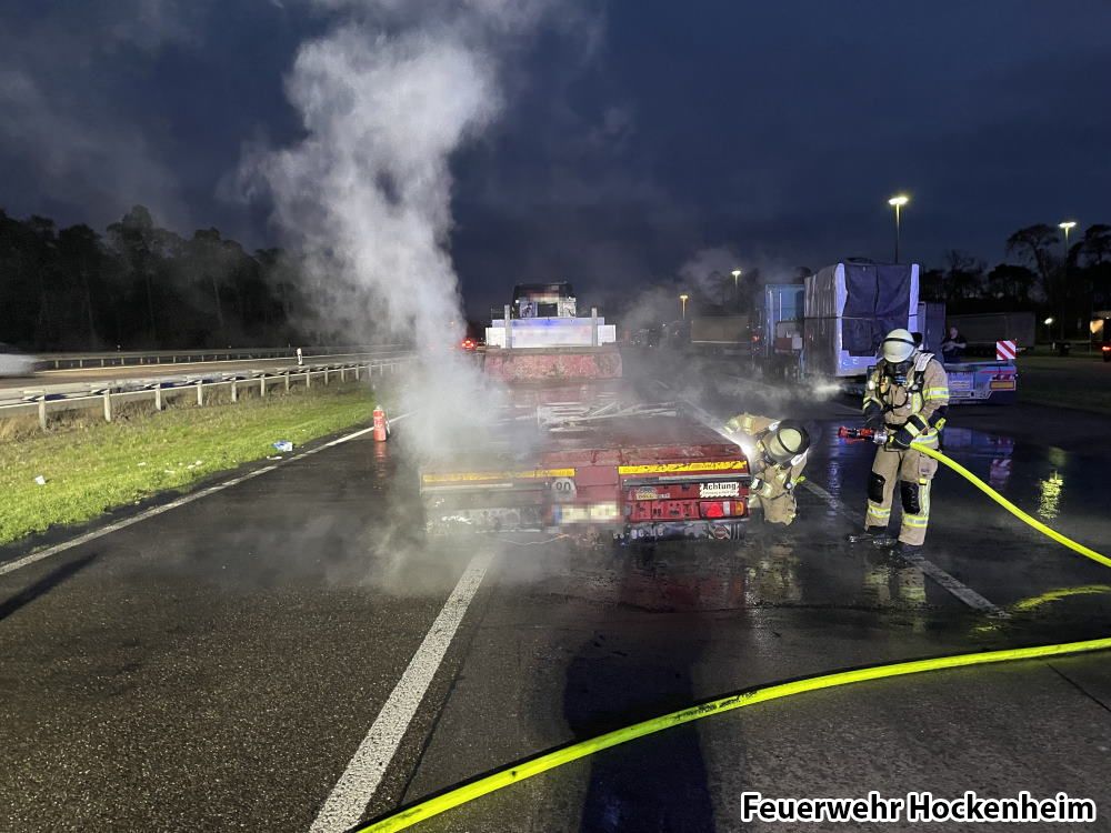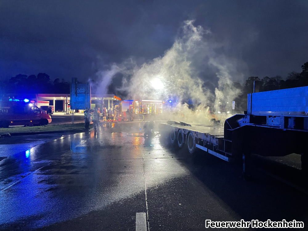 Die Feuerwehr Hockenheim wurde zu einem LKW Brand auf die Rastsätte West am Hockenheimring alarmiert. Bei Eintreffen stand das Heck eines Tiefladers in Brand. Der LKW-Fahrer hatte bereits erste Löschversuche unternommen. Durch einen Trupp unter PA wurde das Feuer mittels Schnellangriffseinrichtung des Löschfahrzeugs gelöscht. Außerdem wurde die Einsatzstelle ausgeleuchtet. Durch das Tanklöschfahrzeug wurde im weiteren Velauf des Einsatz Wasser an das Löschfahrzeug abgegeben. Abschließend wurde der Tieflader mittels Wärmebilödkamera kontrolliert und die Einsatzstelle an die Polizei übergeben