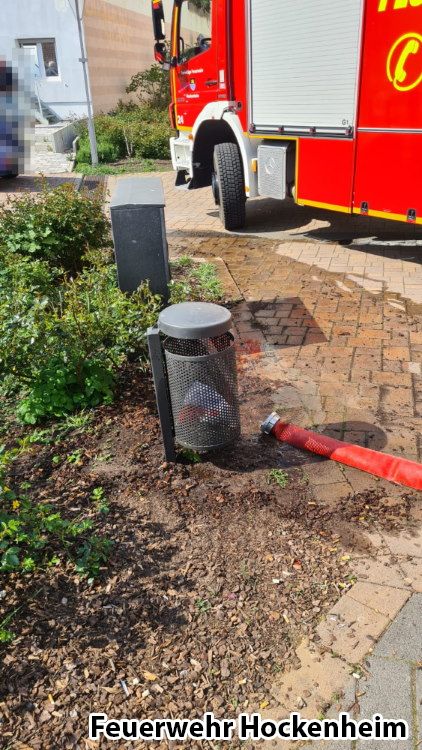 Die Feuerwehr Hockenheim wurde zu einem Mülleimerbrand auf dem Zehntscheunenplatz alarmiert. Vor Ort konnte eine leichte Rauchentwicklung aus Mülleimer wahrgenommen werden. Mülleimer mittels Wasser abgelöscht.
