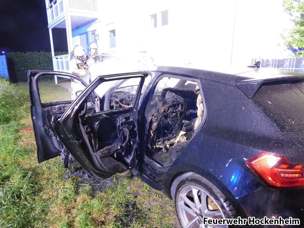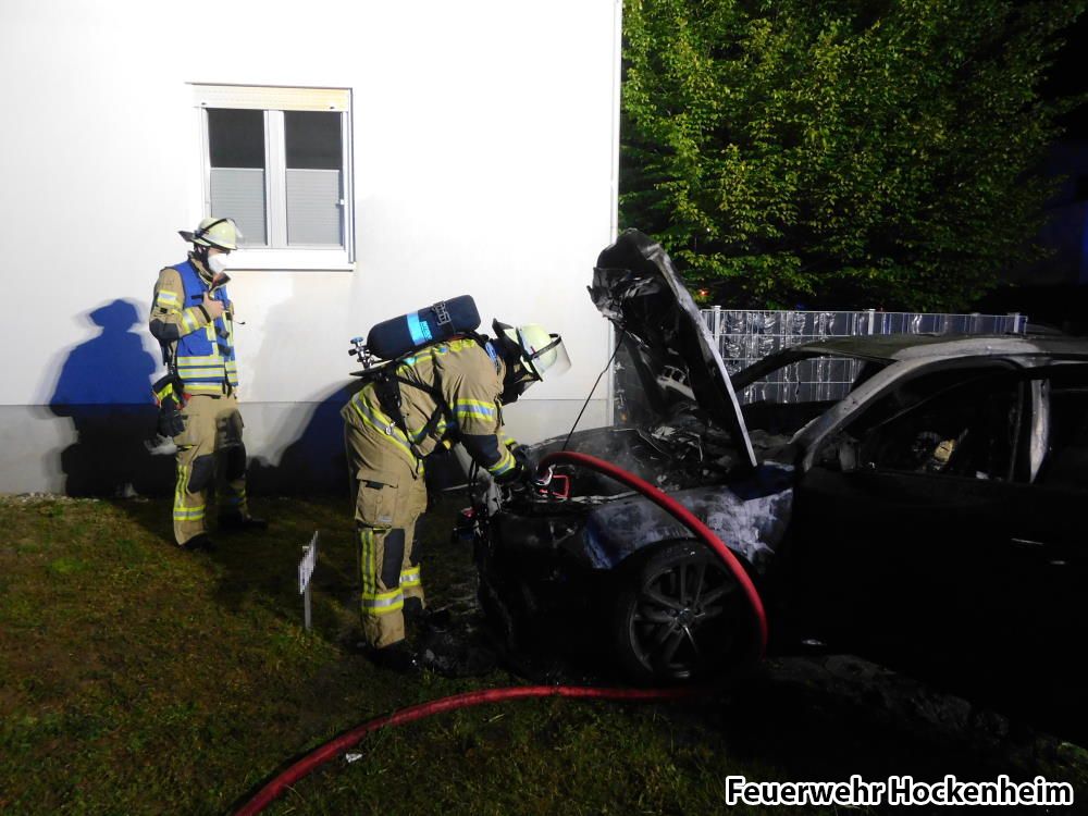 Die Feuerwehr Hockenheim wurde zu einem Fahrzeugbrand in die Albert-Einstein-Straße alarmiert. Bei Eintreffen befand sich der PKW in Vollbrand. Der Brand wurde mit einem C-Rohr unter Atemschutz abgelöscht. Das angrenzende Wohnhaus wurde kontrolliert, dieses war allerdings bereits geräumt. Weil der brennende PKW sehr nah am Wohngebäude stand, wurde die Fassade gekühlt. Im Anschluss wurde der PKW und die Fassade mittels Wärmebildkamera kontrolliert. Da in einer der oberen Wohnung das Fenster gekippt war und Brandrauch in die Wohnung zog, wurde eine Überdruckbelüftung durchgeführt.