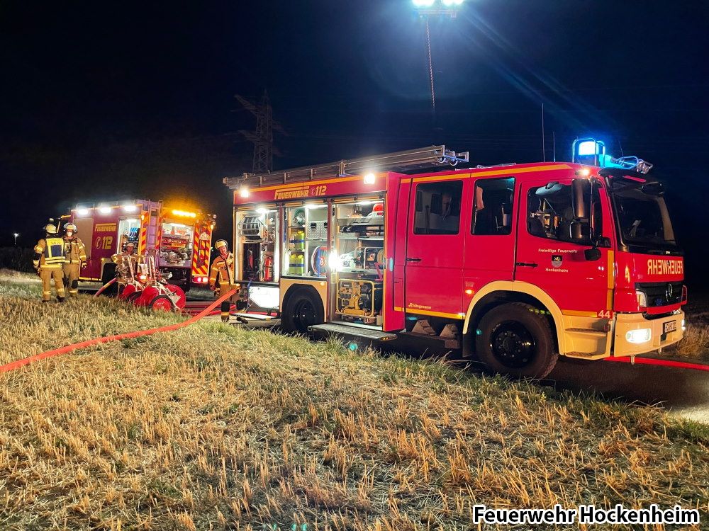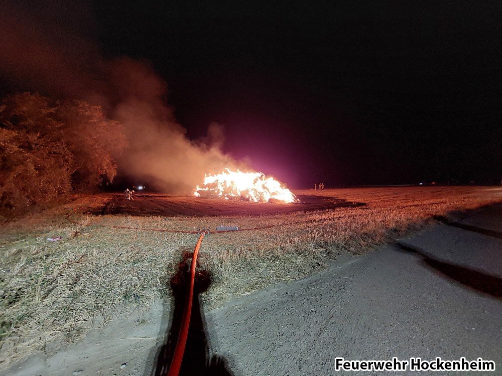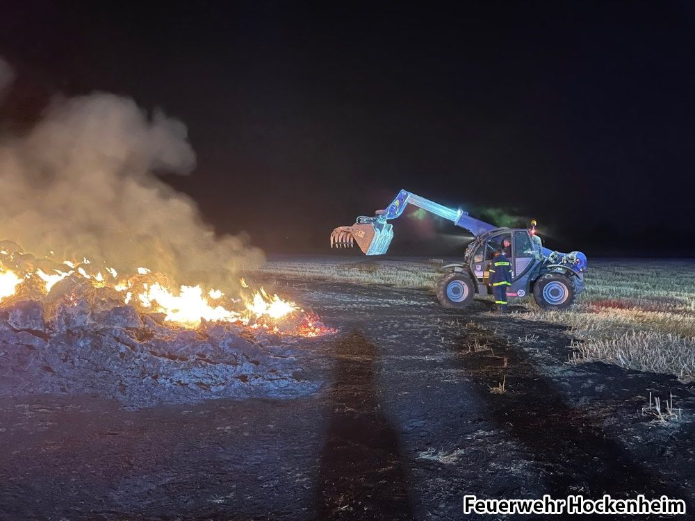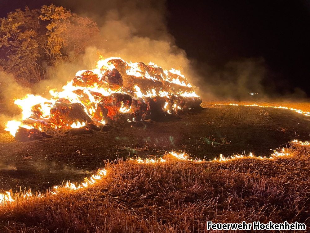 Die Feuerwehr Hockenheim wurde zu einem Strohballenbrand an der L722 alarmiert. Bei Eintreffen brannten ca. 100-120 aufgesetzte Rundballen, sowie umlaufend der Stoppelacker. Der Stoppelacker wurde mit drei C-Rohren abgelöscht.