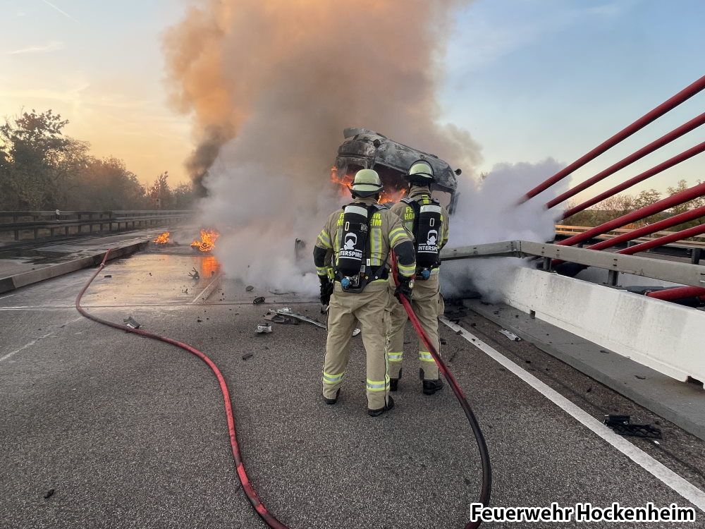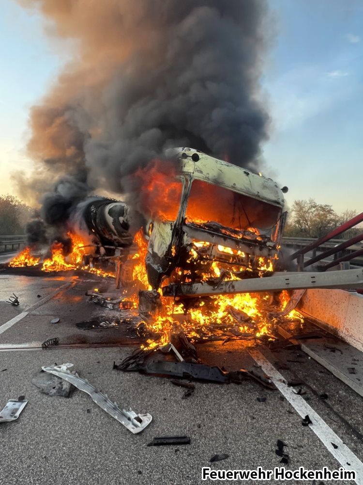 Die Feuerwehr Hockenheim wurde zu einem Fahrzeugbrand mit der Meldung "Vollbrand Tankzug nach Verkehrsunfall" alarmiert. Bei Eintreffen stand der Tankzug in Vollbrand. Es waren keine Personen eingeklemmt. Die Brandbekämpfung wurde mit zwei C-Rohren und mehreren Trupps unter Atemschutz durchgeführt. Zur Unterstützung der Brandbekämpfung und zur Sicherstellung der Wasserversorgung wurden die Feuerwehren aus Altlußheim und Reilingen angefordert. Ein Dieseltank am LKW wurde mittels Pulverlöschern abgelöscht. Am Grünstreifen wurde zum Eindeichen des Löschwassers Bindemittel aufgebracht. Abschließend wurde die Einsatzstelle an Polizei und Autobahnmeisterei übergeben.