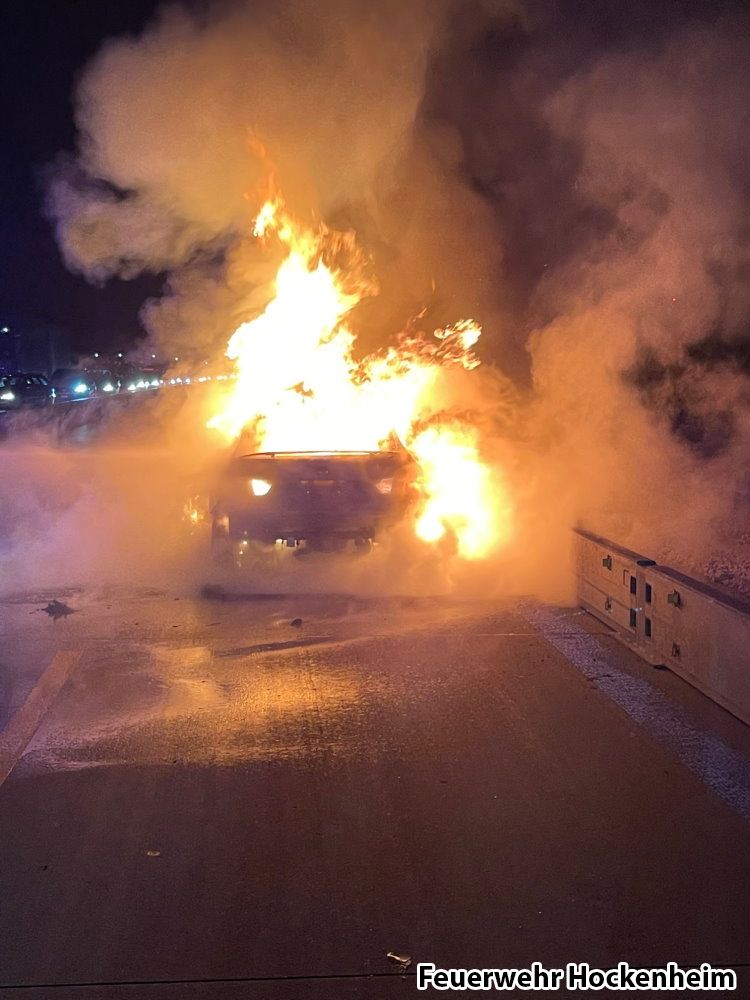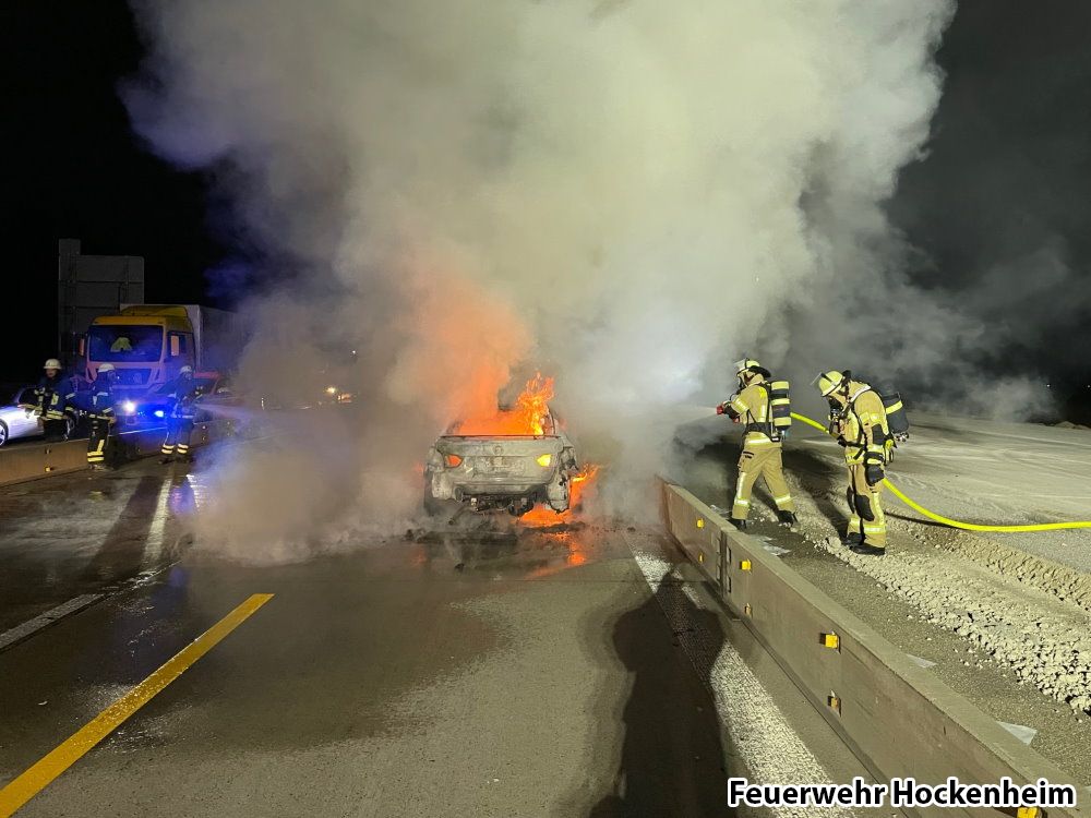 Die Feuerwehr Hockenheim wurde zu einem PKW Fahrzeugbrand auf die BAB 6 alarmiert. Bei Eintreffen stand der PKW in Vollbrand. Die Einsatzstelle befand sich im Baustellenbereich. Der Fahrer befand sich außerhalb des PKW. Das erste Rohr wurde durch die Feuerwehr Walldorf vorgenommen. Durch das LF 10 wurde ein weiteres C-Rohr vorgenommen, sowie die Einsatzstelle ausgeleuchtet. Während der Löschmaßnahmen wurde die Richtungsspur in Richtung Heilbronn vollgesperrt, teilweise ebenso die Gegenrichtung. Da das TLF aus Hockenheim nicht durch die Rettungsgasse fahren konnte, wurde das Hockenheimer LF noch mit Wasser aus dem LF von Walldorf versorgt, bevor die Feuerwehr Walldorf anschließend die Einsatzstelle verlassen hat. Abschließend wurde der PKW mittels Wärmebildkamera kontrolliert und die Einsatzstelle an die Autobahnpolizei übergeben.